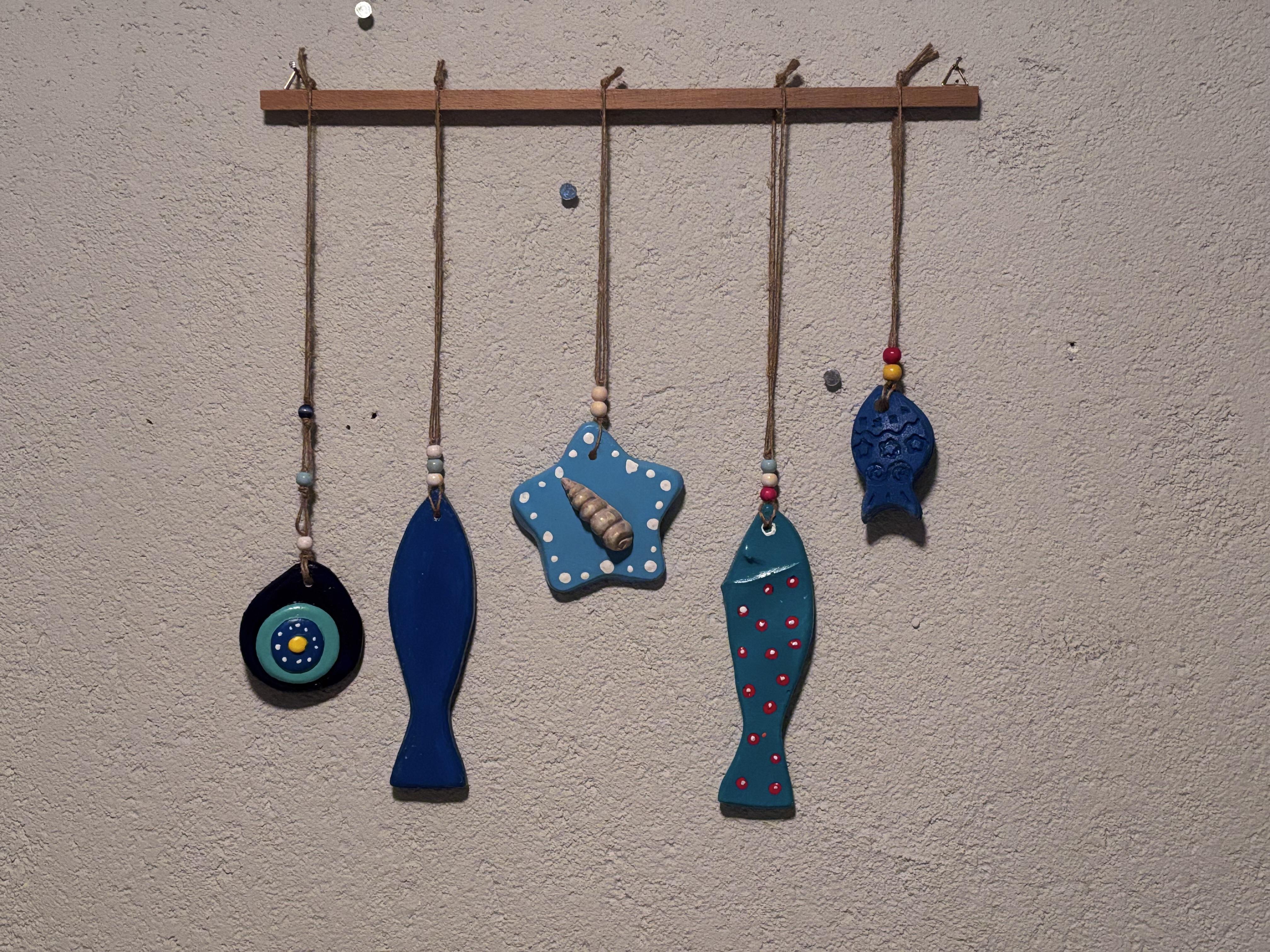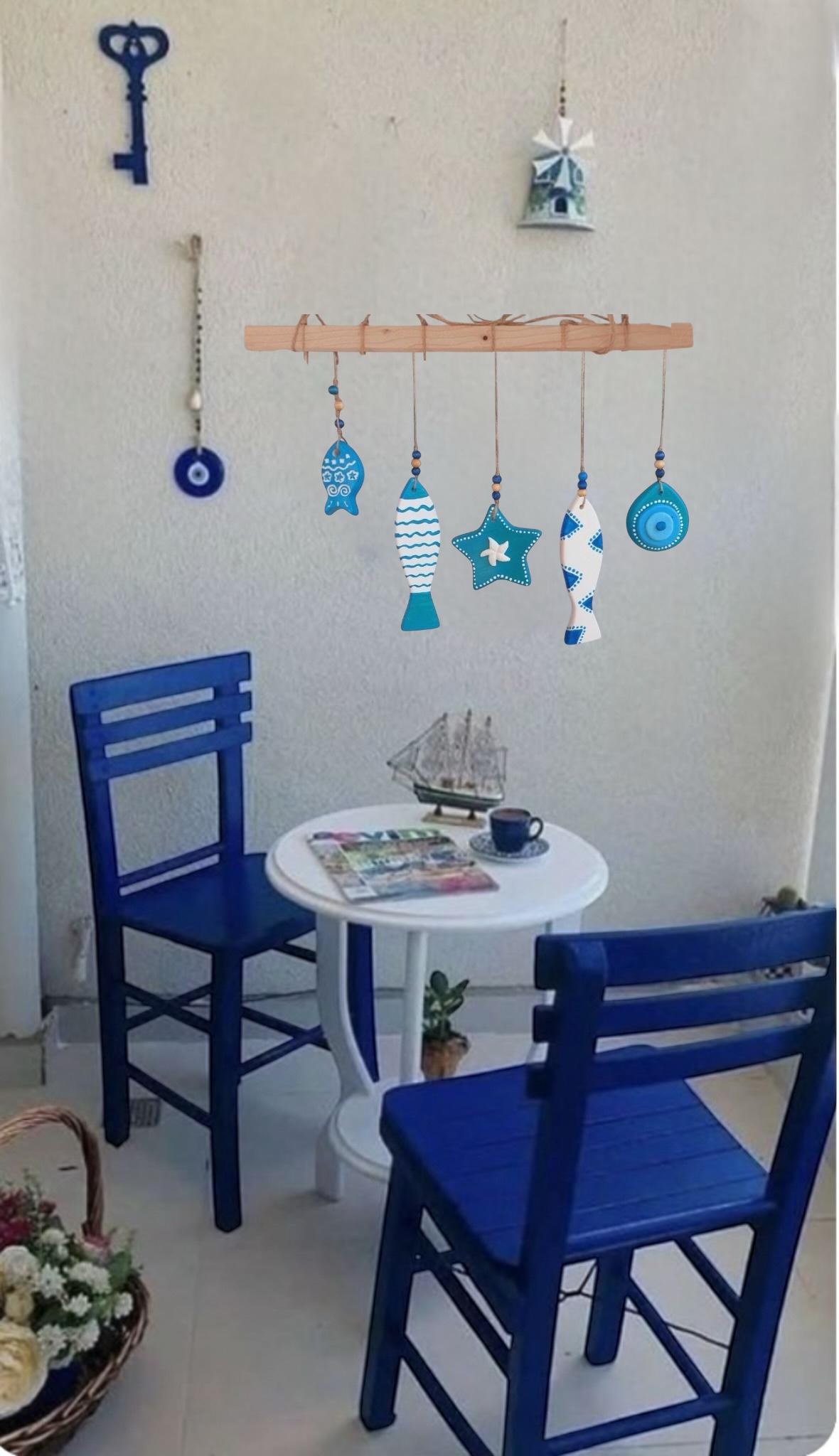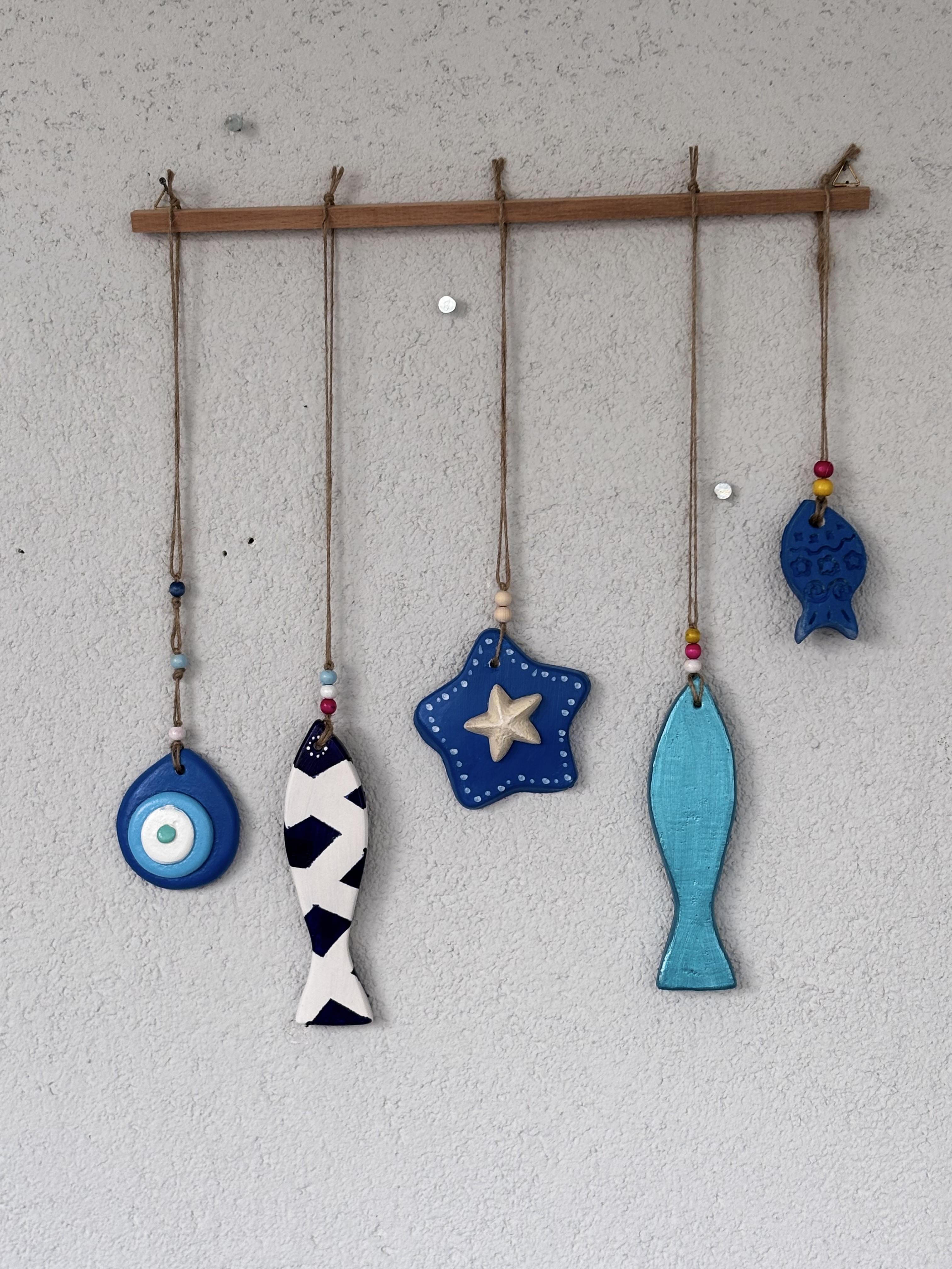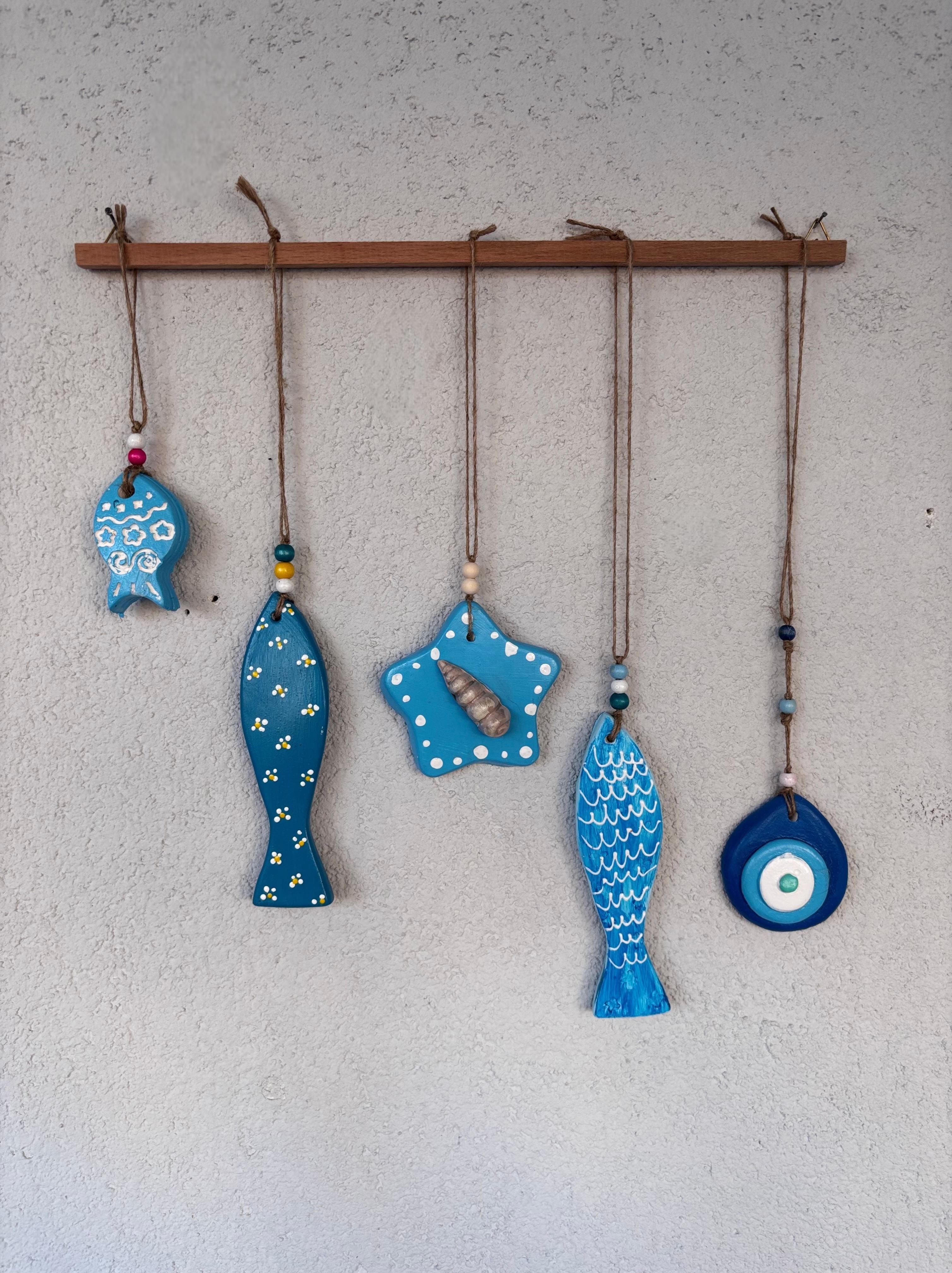 Ölçü: Ahşap çubuk:40cm, Objeler: uzun balık-17cm,küçük balık-7cm, yıldız-10cm,Nazar boncuk-8cm