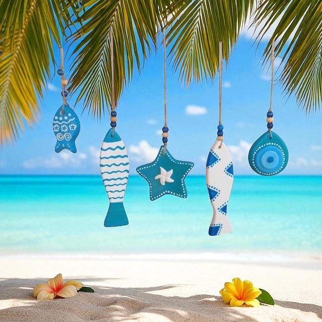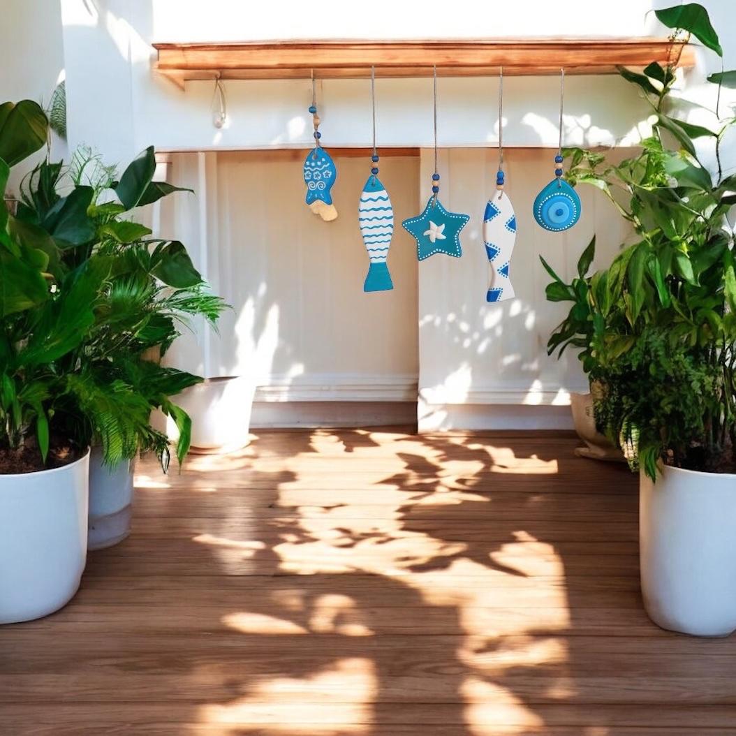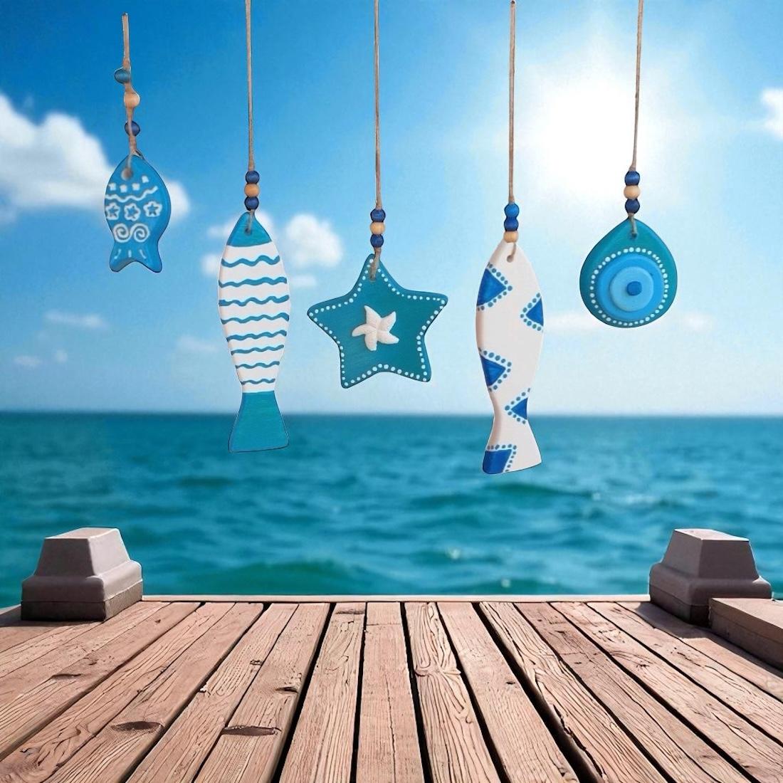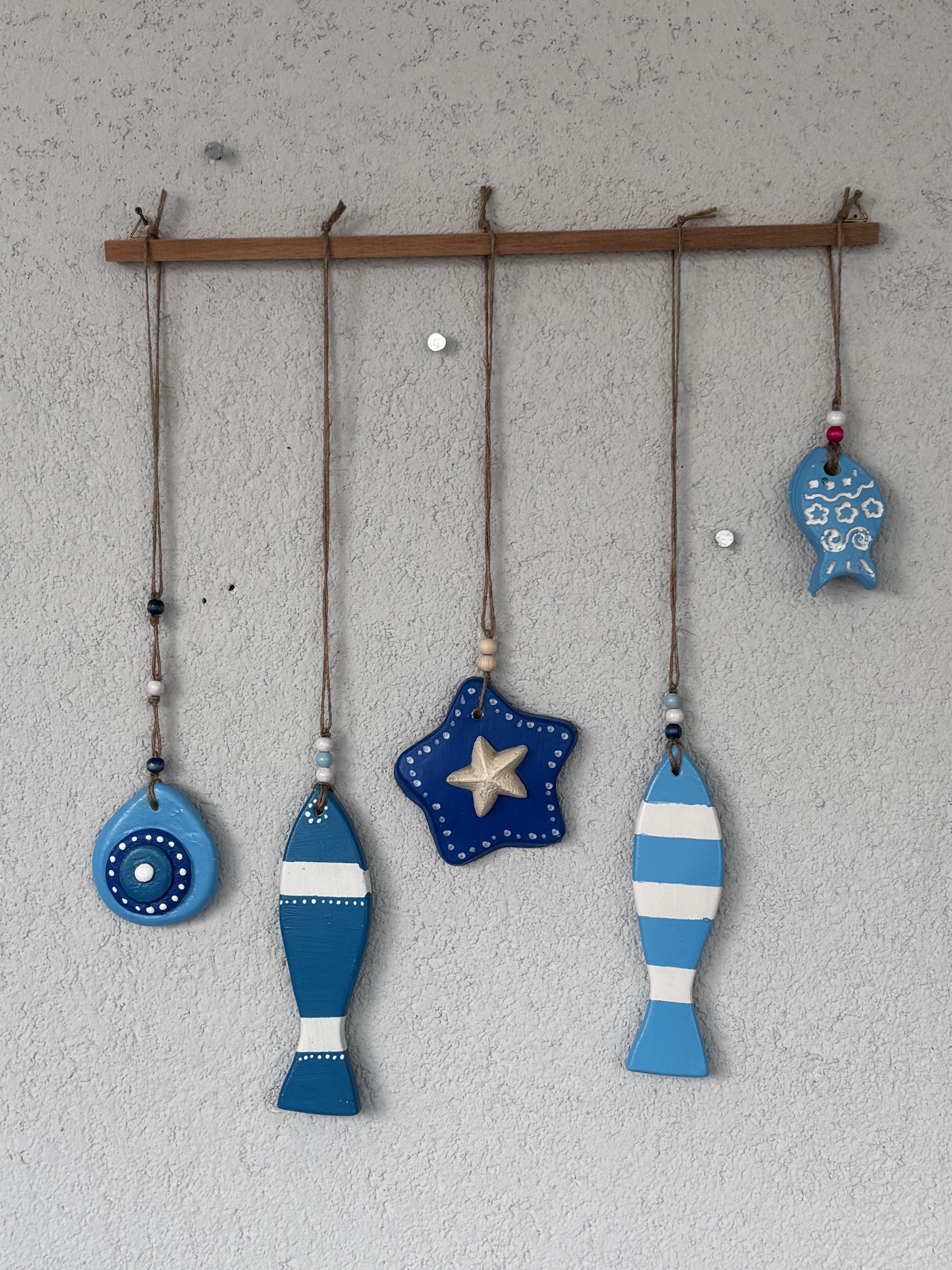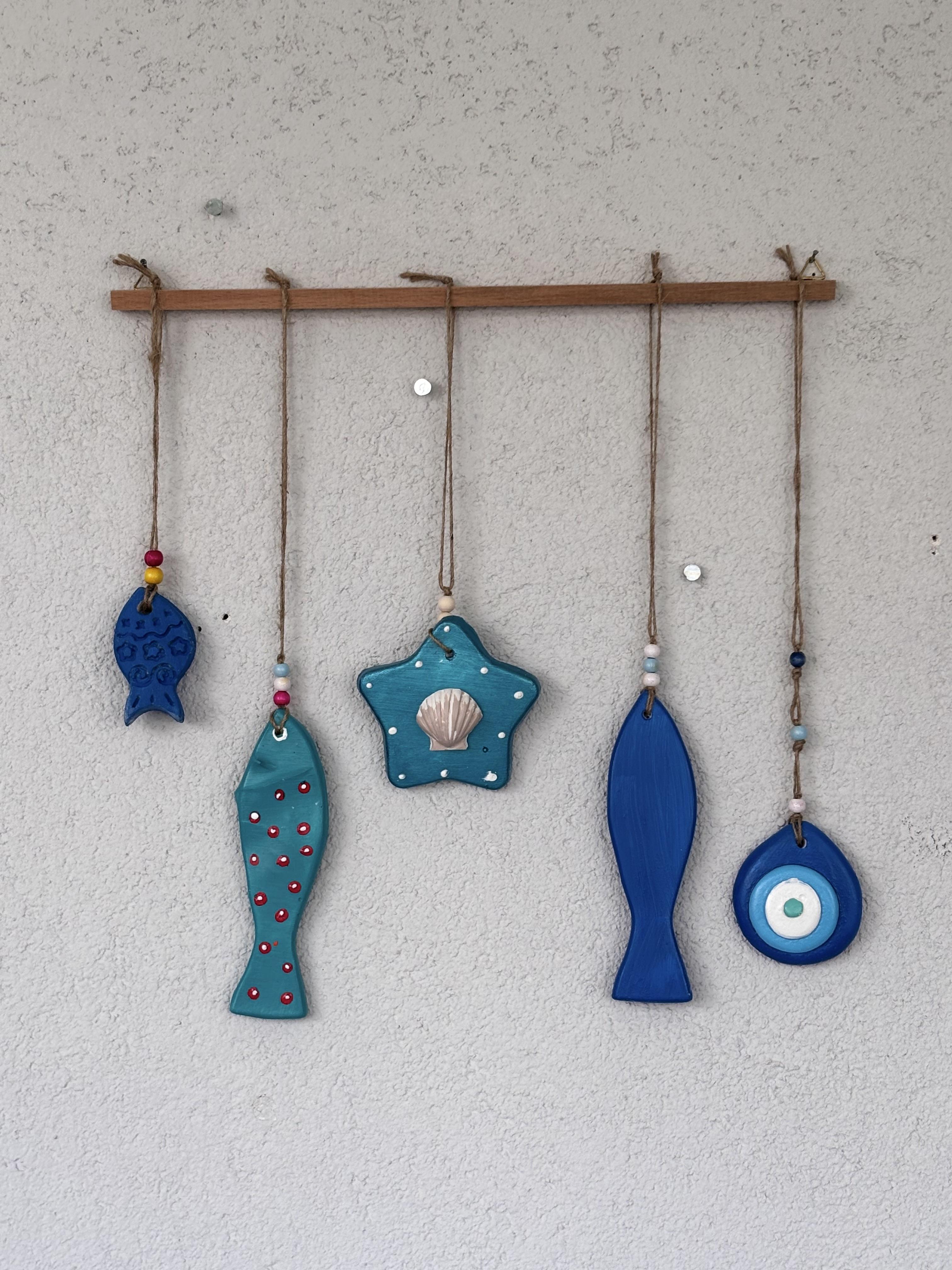 Ölçü: Ahşap çubuk:40cm, Objeler: uzun balık-17cm,küçük balık-7cm, yıldız-10cm,Nazar boncuk-8cm