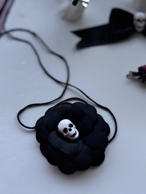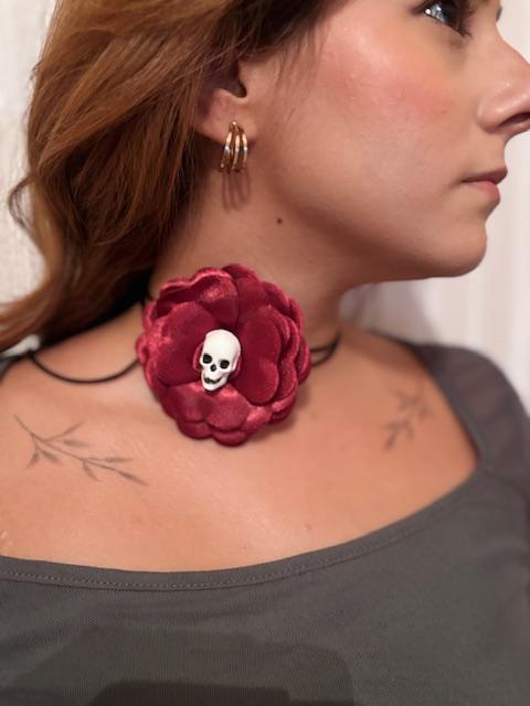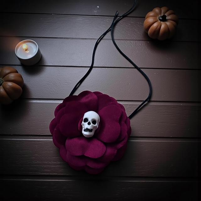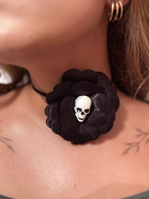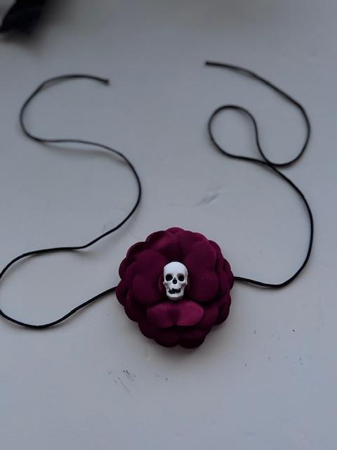 Saten çiçeğin sıcaklığı, kafatası figürünün gizemiyle buluşuyor.