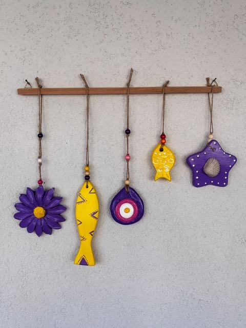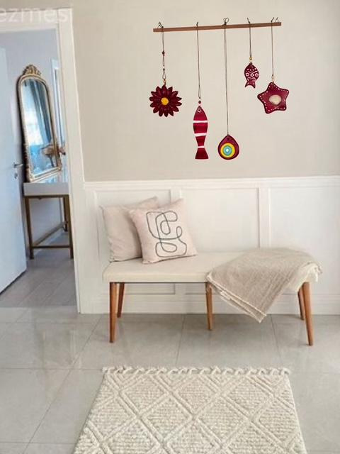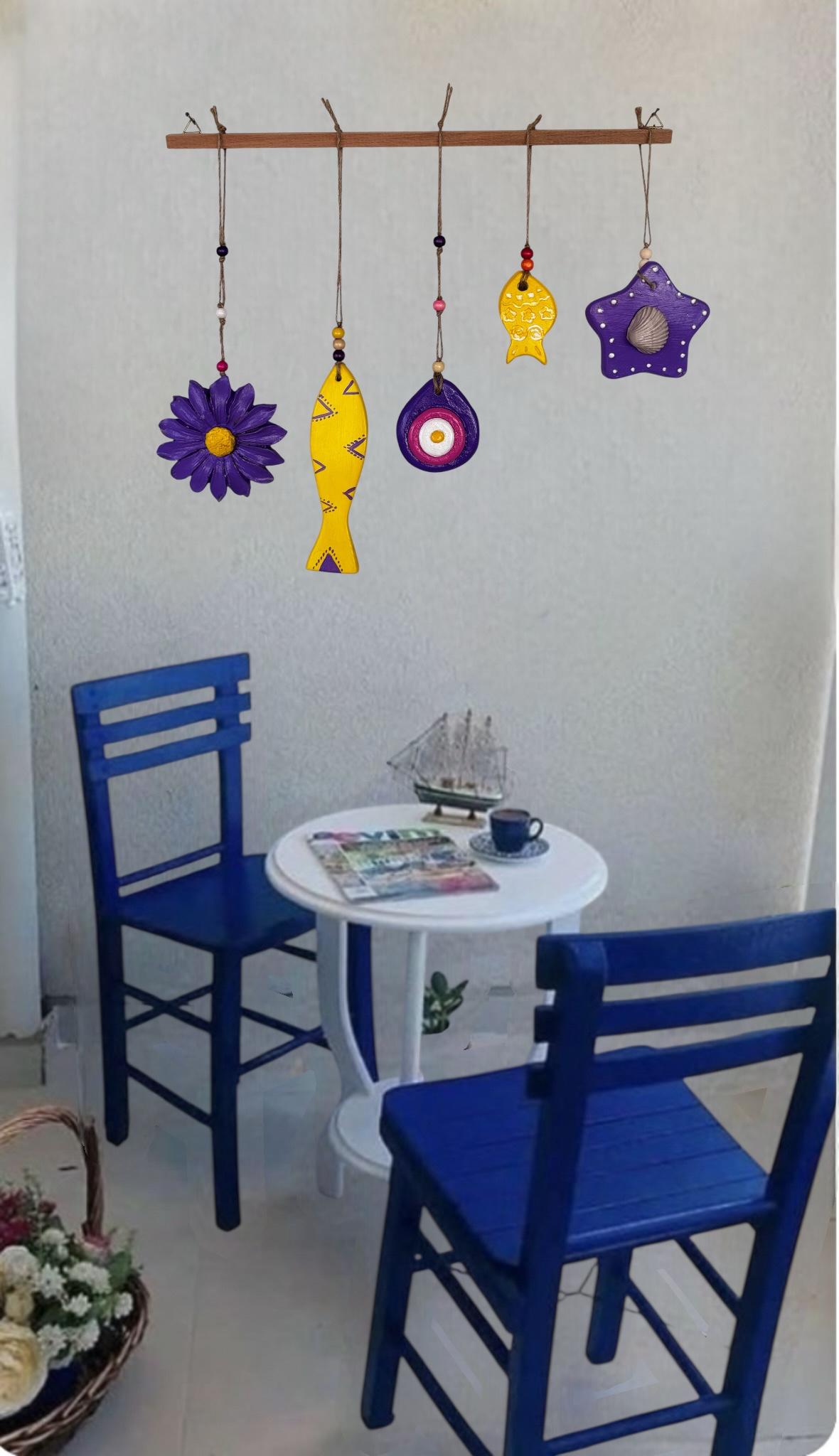 Ölçü: Ahşap çubuk:40cm, Objeler: uzun balık-17cm,küçük balık-7cm, papatya-11cm, Yıldız-10cm, Nazar boncuk-9cm