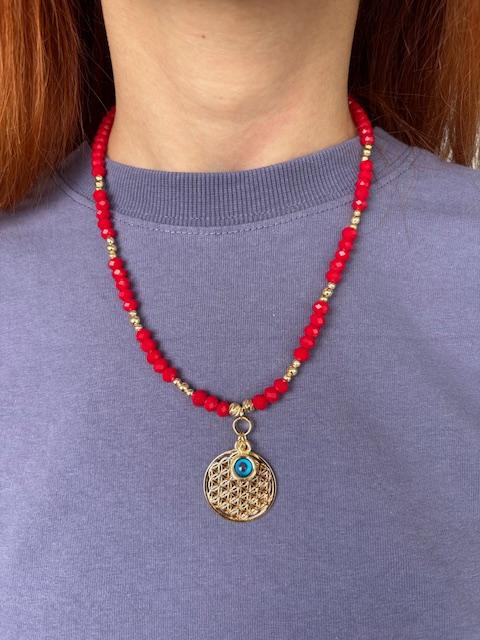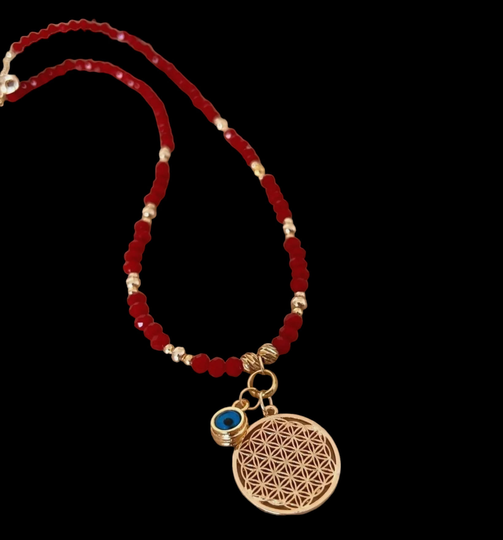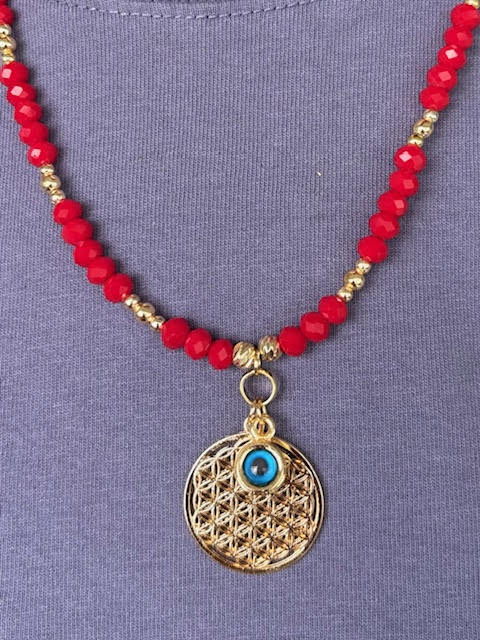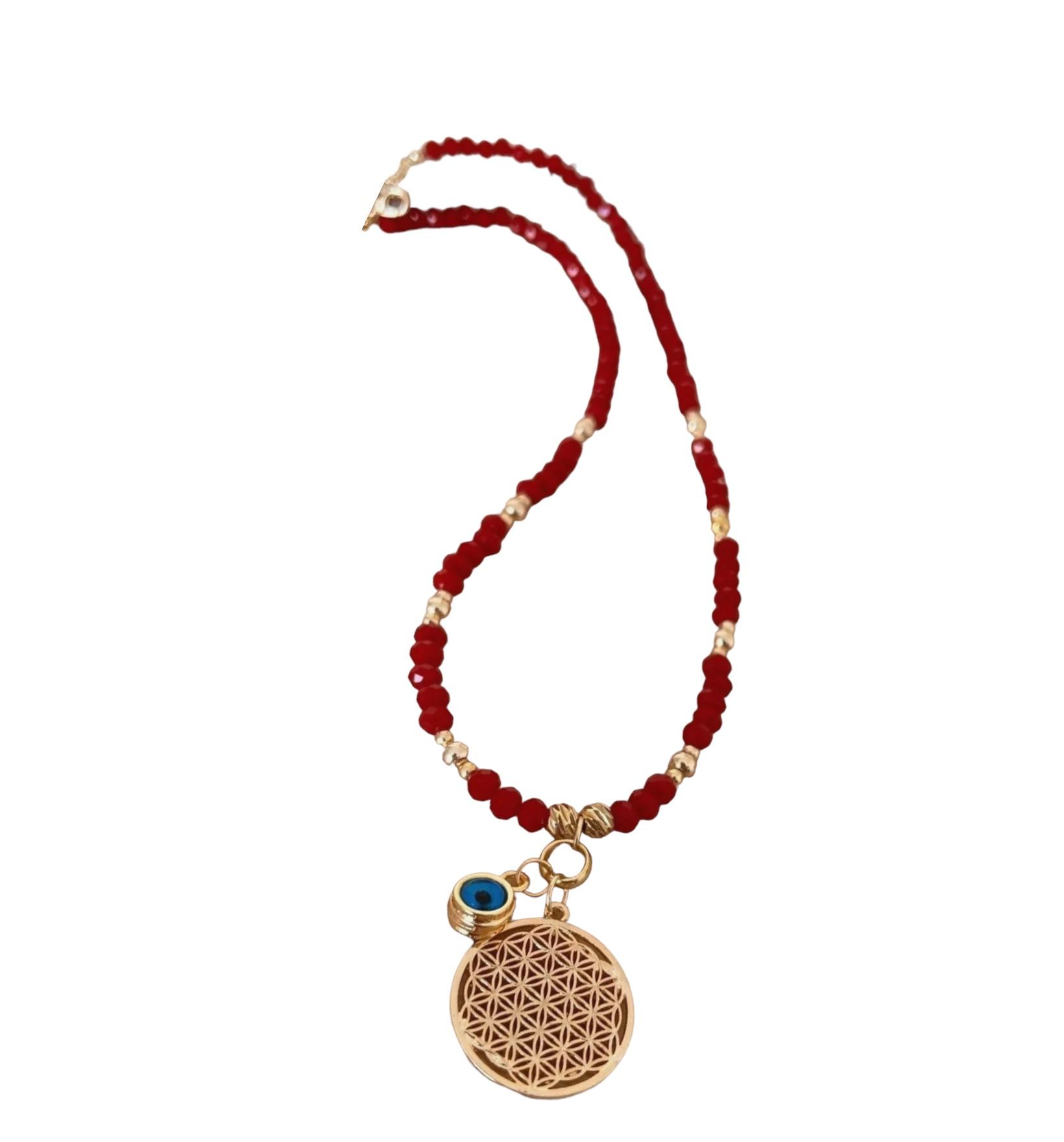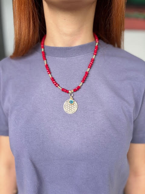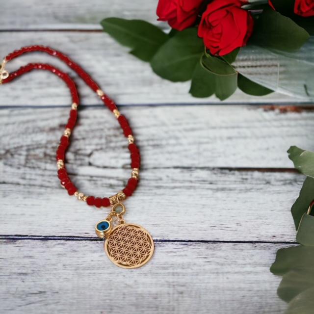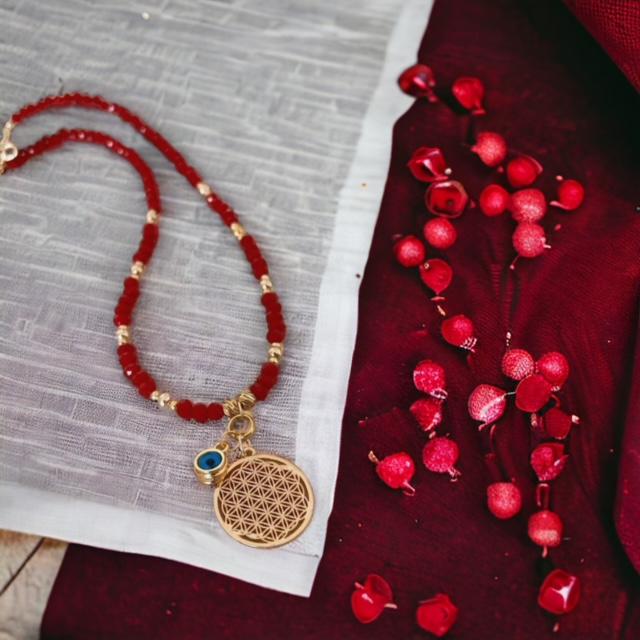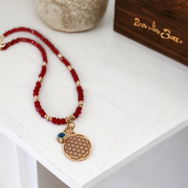 Ürün materyali: yaşam çiçeği-pirinç, lak kaplamadır. Kırmızı kristal taş boncuk kullanılmıştır.