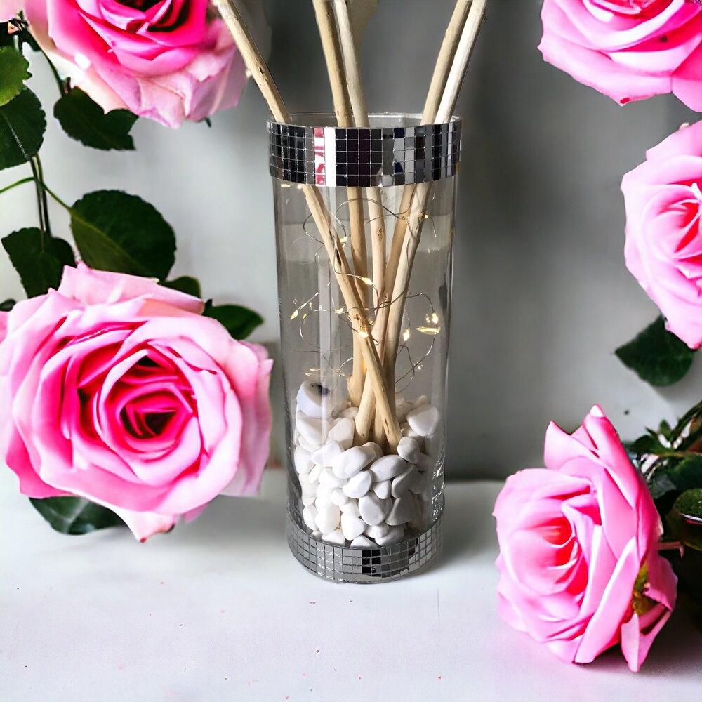 - Beyaz taş dolgulu, buton ayna kaplamalı silindir Vazo (23cm)