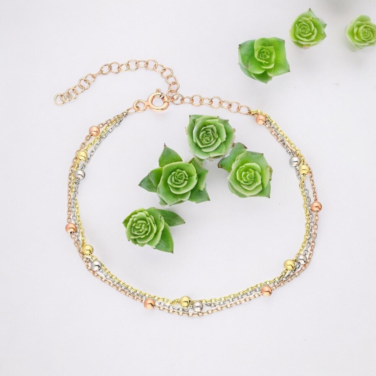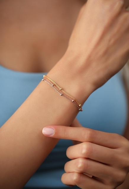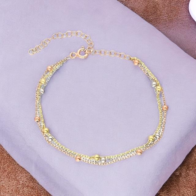 İster bileklik ister halhal şeklinde kullanılabilmektedir.Görseldeki gibi Gold-rose-gümüş top zincirleri birleşik haldedir.Bileklik uzunluğu ek zincir haricinde 17cm dir.Hijyen nedeniyle değişim ve iade yoktur.