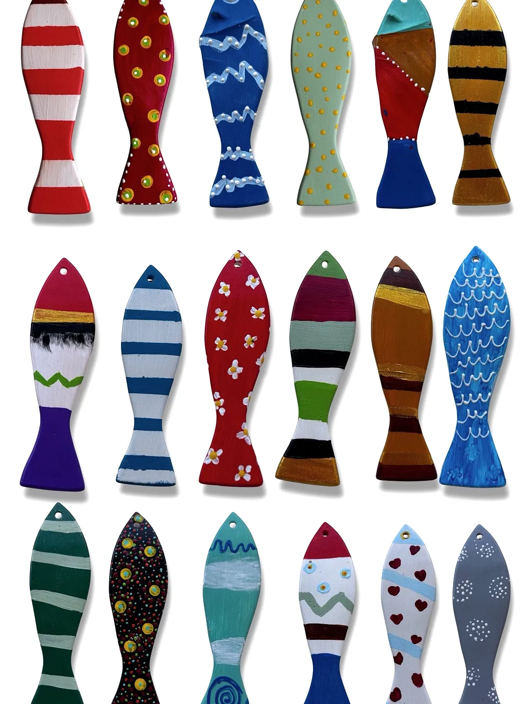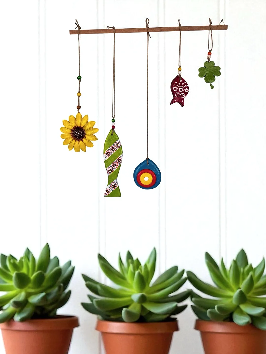 Ölçü: Ahşap çubuk:40cm, Objeler: uzun balık-17cm,küçük balık-7cm, papatya-11cm, Yonca- 5cm,Nazar boncuk-8cm